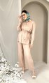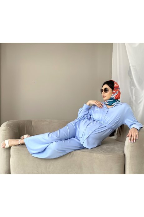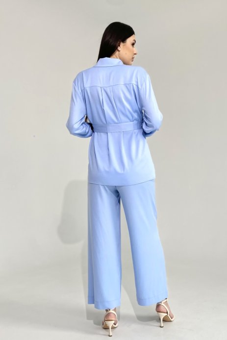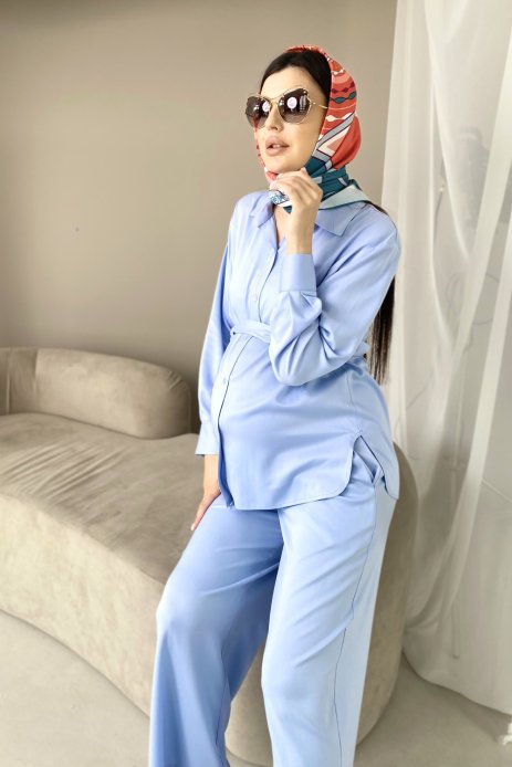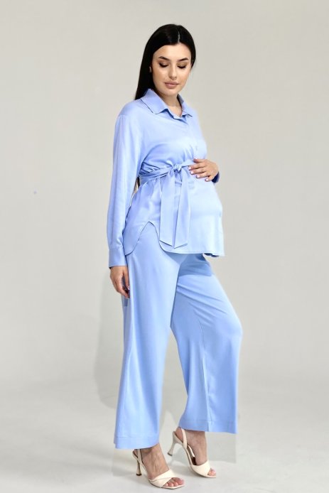 Костюм створений з якісної, легкої, бавовняної тканини зі стрейчем, яка надає йому комфорт і стиль. Сорочка з поясом. Штани мають високу посадку і резиночку, яка регулюється по мірі росту животика, що забезпечує додатковий комфорт.