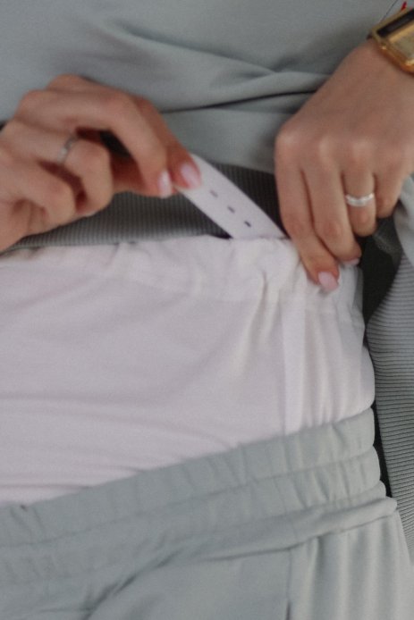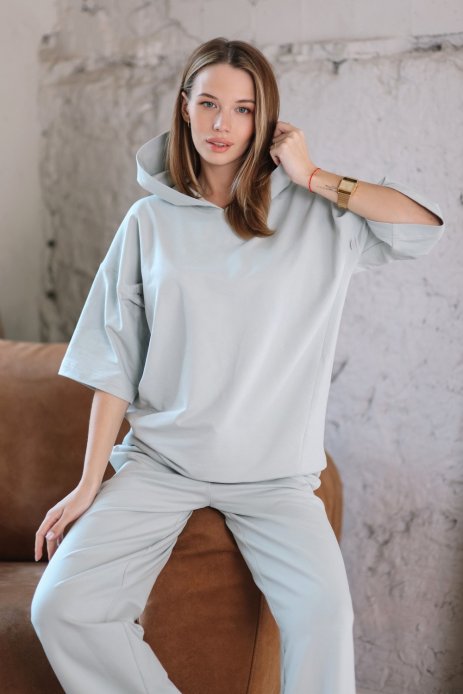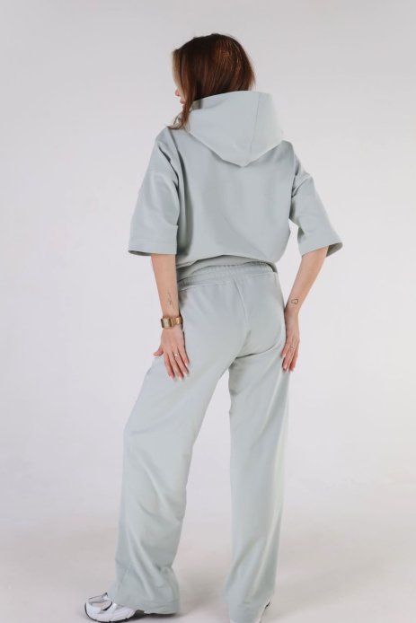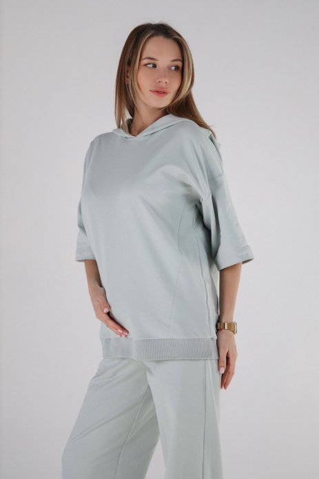 Костюм для вагітних та годуючих мам створений, щоб забезпечити комфорт та стиль у будь-який час. З капюшоном і рукавом 3/4 він поєднує в собі практичність і елегантність, дозволяючи вам залишатися активними та модними під час вагітності і після народження малюка. Комфорт і мода об'єднуються в цьому костюмі, створеному спеціально для вашого найважливішого життєвого етапу. На штанах можна відпороти трикотажну вставку і після пологів носити як звичайні штани.