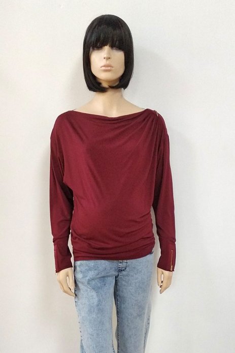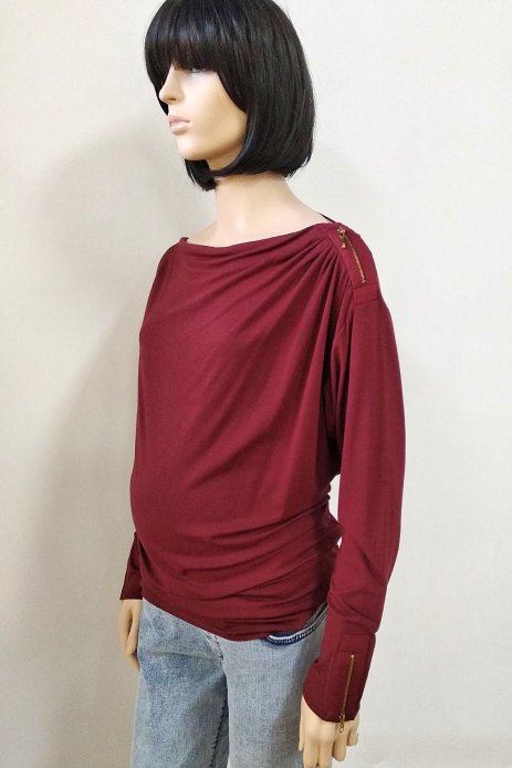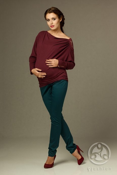 Элегантная блуза для беременных женщин. Свободный силуэт с заужением к низу. Рукава втачаны в сильно углубленные проймы и по внешнему виду напоминают цельнокроеные рукава «летучая мышь». Оригинальное решение использования молнии в качестве декора по плечу и низу рукавов- тренд этого сезона, придает модели особый шарм. Эту блузу вы с удовольствием продолжите носить и после беременности.