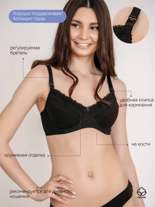 Модель бюстгальтера для беременных и кормящих из эластичного хлопкового трикотажа с прозрачным кружевом по краю чашки. Специальный крой чашечки со специальной вшивной поддержкой, которая переходит в широкую бретель. Необходимую поддержку груди в больших раз мерах обеспечат специальные гибкие косточки, которые не передавливают грудь. Модель имеет удобную специальную застежку, которая позволяет отстегивать и застегивать чашечку одной рукой. Мягкие швы бюстгальтера для кормления не раздражают чувствительную кожу. Кружевные вставки позволят подчеркнуть красоту груди и выглядеть исключительно привлекательно. Акцентным украшением модели является маленький бант. Бюст элегантный и чувственный, отлично поможет создать утонченный соблазнительный образ.
