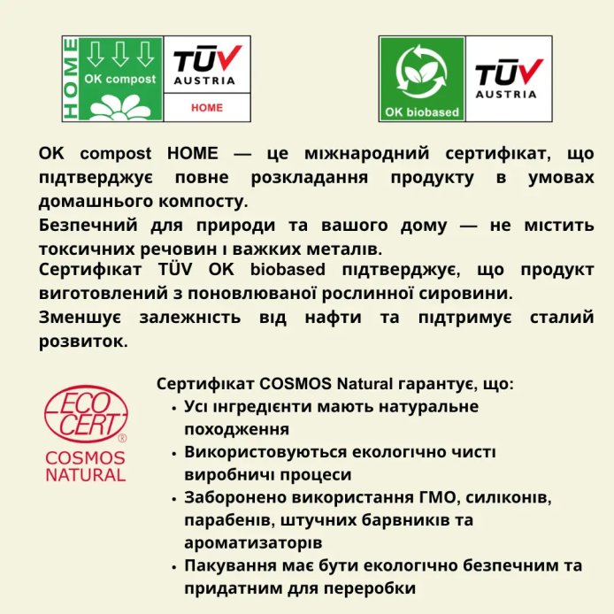 Гіпоалергенні. Підходять для чутливої шкіри. Підтримують природний кислотний баланс шкіри: рН 4,50 +/- 0,50. Серветки мають екосертифікати: EcoCert, Vegan (V-Label), OK Compost, Hypoallergenic.