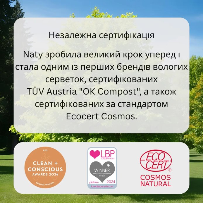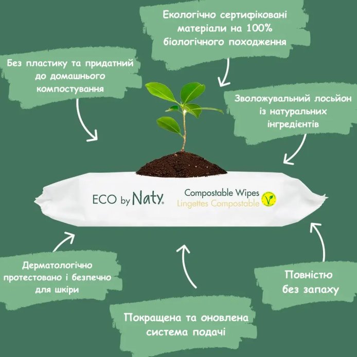 Вони виготовлені з біорозкладної целюлози без ГМО і на 98,5% просочені очищеною водою. Не містять спирту, хлору, парабенів, фталатів, штучних барвників та синтетичних ароматів. Завдяки цьому, вологі серветки Eco by Naty дбайливо очищають і доглядають за шкірою малюка, не викликаючи алергічних реакцій, свербіння і почервоніння.