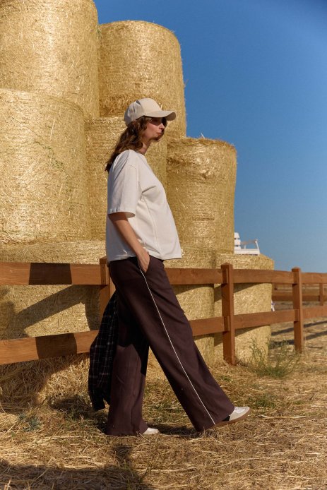 Футболка оверсайз, прямого крою з акуратним круглим вирізом зі спущеними плечима. Рукава без одворотів.
