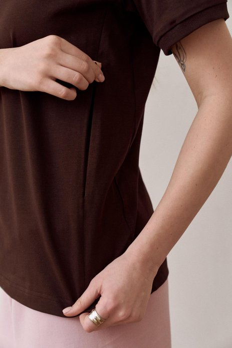 Водночас після пологів вона залишається актуальною завдяки спеціальним секретам для годування: дві потаємні блискавки, що відкриваються знизу вгору, дозволяють швидко й непомітно погодувати малюка в будь-яких умовах. Блискавки вшиті в спеціально розроблені конструктивні лінії, тому зовнішній вигляд футболки залишається естетичним і стриманим.