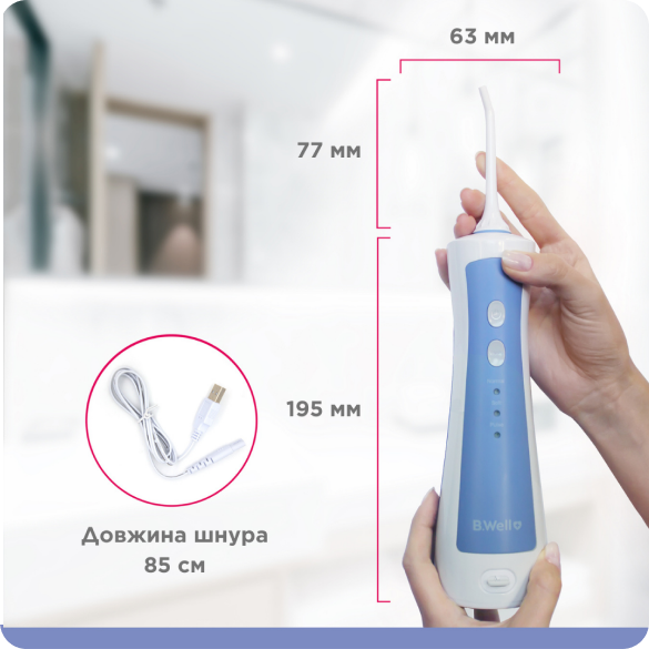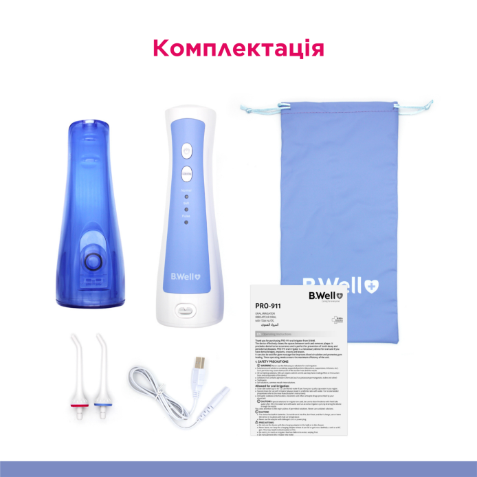 Портативний іригатор B.Well підійде кожному користувачу, завдяки своїй компактності та універсальності. Іригатор B.Well PRO-911 підходить для очищення пломб, мостів, імплантів, коронок і брекетів. Завдяки тому що в комплекті є змінні насадки, іригатор зручний для двох користувачів.