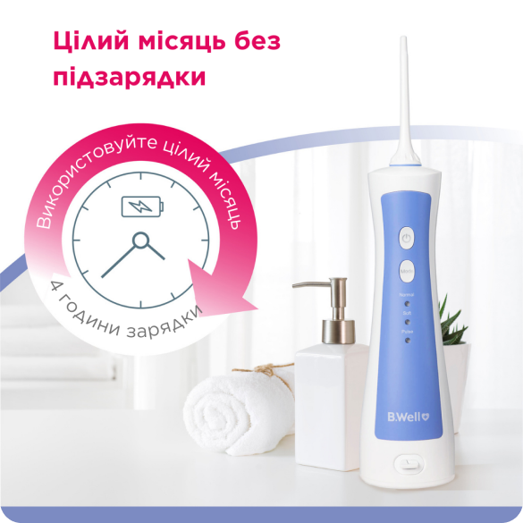 Портативний іригатор PRO-911 не тільки ефективно видаляє залишки їжі, а й перешкоджає розмноженню бактерій, утворенню зубного каменю, розвитку карієсу та низці інших проблем, спричинених недостатнім доглядом. Основною функцією іригатора моделі B.Well PRO-911 є масаж (гідромасаж) слизової оболонки порожнини рота. Іригатор B.Well не потребує розетки у ванній кімнаті або батарейок - живлення здійснюється від сучасного акумулятора.