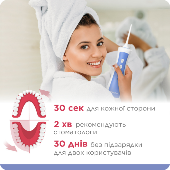 Насадка обертається на 360°, щоб очистити важкодоступні місця. Портативний та компактний: зручно брати з собою, прилад легко поміститься у сумку або рюкзак. Завдяки USB порту іригатор можна зарядити не тільки через USB адаптер, а й портативного зарядного пристрою (powerbank), ноутбука або комп'ютера.