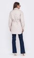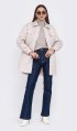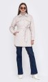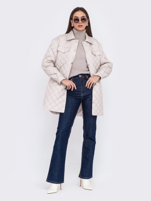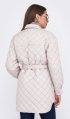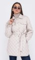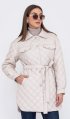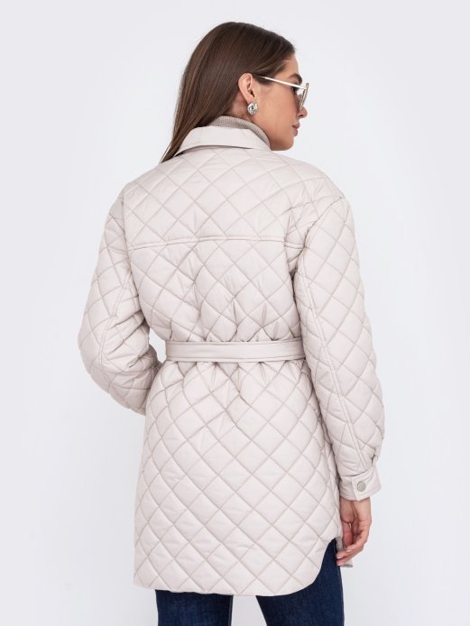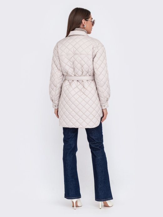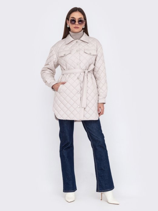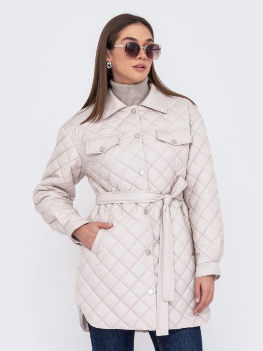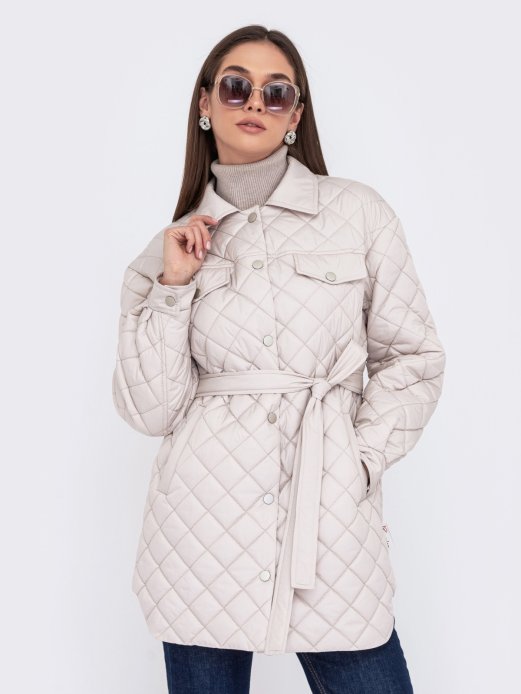Демісезонна стьобана куртка-сорочка на кнопках з декоративними клапанами на поличці. Низ виробу закруглений. Модель із шльовками. Доповнена поясом із основного матеріалу.
