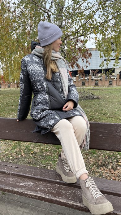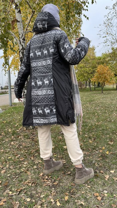 Такую модель, по задумке дизайнера и под собственное настроение, можно носить на две стороны, которые выполнены зеркально, но обыграны разными цветами (однотонный графит и оригинальный норвежский принт "олени"), при этом обе они дополнены интересным решением - на однотонной стороне карманы накладные, а на принтованной - карманы на молниях. Оба варианта весьма удобны, смотрятся стильно и красиво.