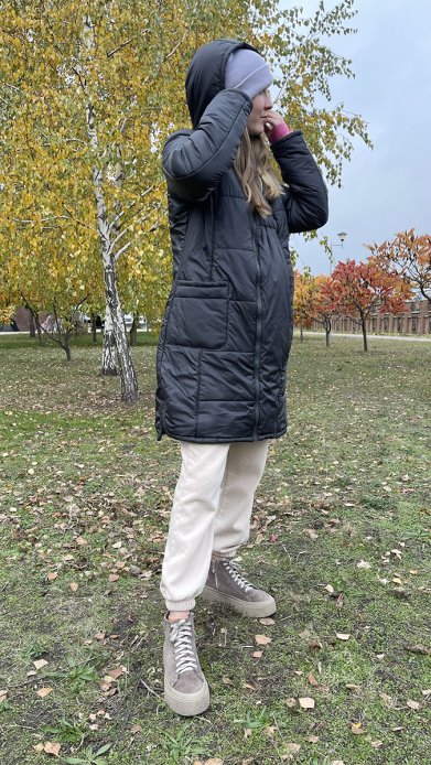 При помощи специальной дополнительной вставки стильное молодежное пальто легко превращается в изделие для беременных, рассчитанное на любой срок. Специальная вставка крепится при помощи легко застегивающихся молний. По бокам небольшие разрезы, капюшон объемный, не отстегивается. Рукава можно подворачивать и делать манжеты.