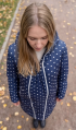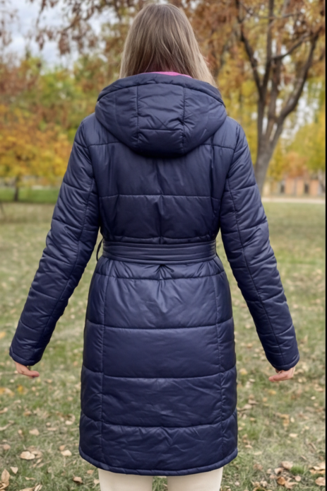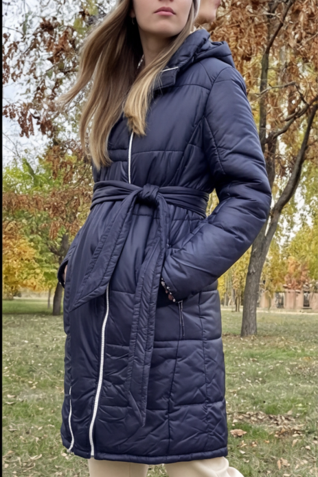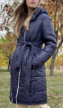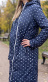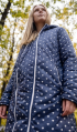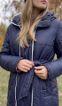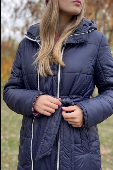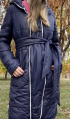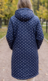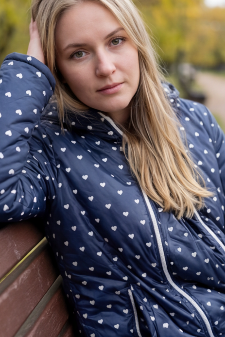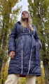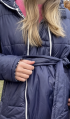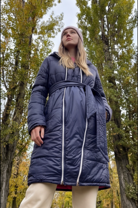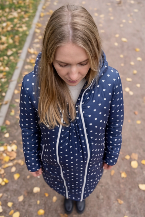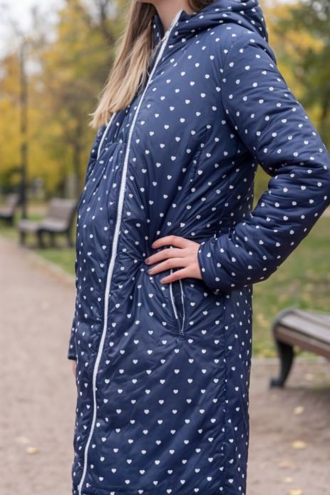 Такую модель, по задумке дизайнера и под собственное настроение, можно носить на две стороны, которые выполнены зеркально, но обыграны разными цветами (одна сторона - однотонный синий, вторая - романтичные сердечки на синем). Карманы куртки на молниях, присутствуют с обеих сторон. Молнии куртки оформлены оригинальным способом – одна половина молнии белая, вторая контрастная - синяя. С однотонной стороны куртка простегана, спереди - горизонтальными строчками, сзади – вертикальными. Оба цветовых варианта весьма удобны, смотрятся стильно и красиво. После окончания беременности такое пальто можно носить как обычное изделие, подвязывая пояс, который прилагается в комплекте. Утепляемся стильно в магазине Мamacity!