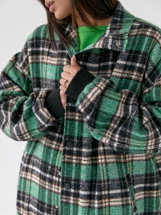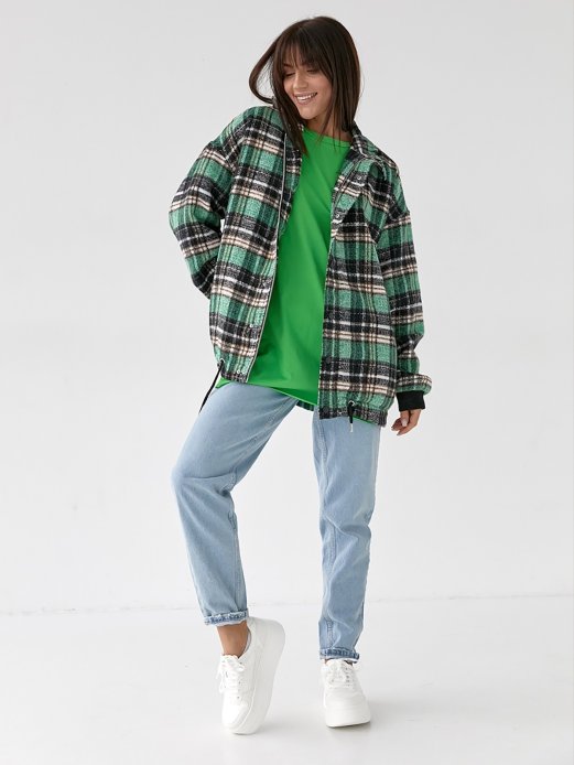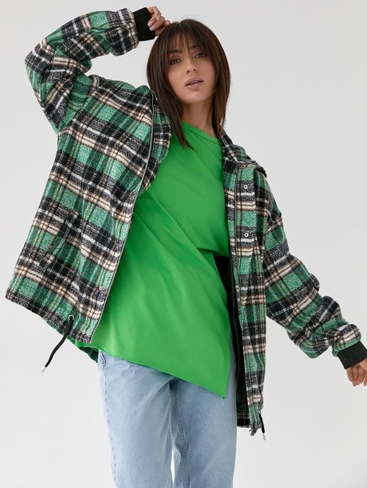 Демісезонна куртка із фланелі на тонкій підкладці. Виконана з високоякісного турецького матеріалу. Модель у стилі оверсайз із довгими рукавами, які закінчуються трикотажними манжетами. Попереду розташовані прорізні кишені. Внизу є куліска із зав'язками, що допомагає регулювати обсяг. Застібається на блискавку та кнопки.