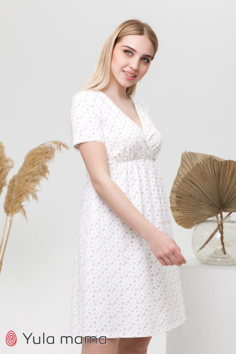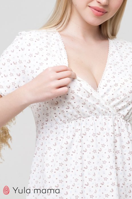 Базовая ночная сорочка для беременных и кормящих. Изделие из хлопкового трикотажа, имеет полуоблегающий лиф и свободную юбку. Секрет кормления: запа́х на груди. Отделка: ажурная резиночка по горловине и низу рукавов. В такой красивой сорочке Вы будете выглядеть великолепно из магазина Мamacity!