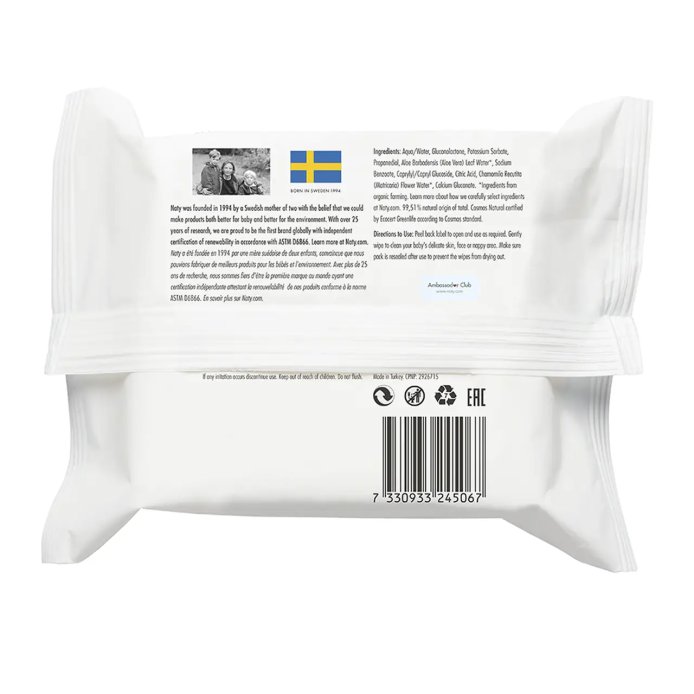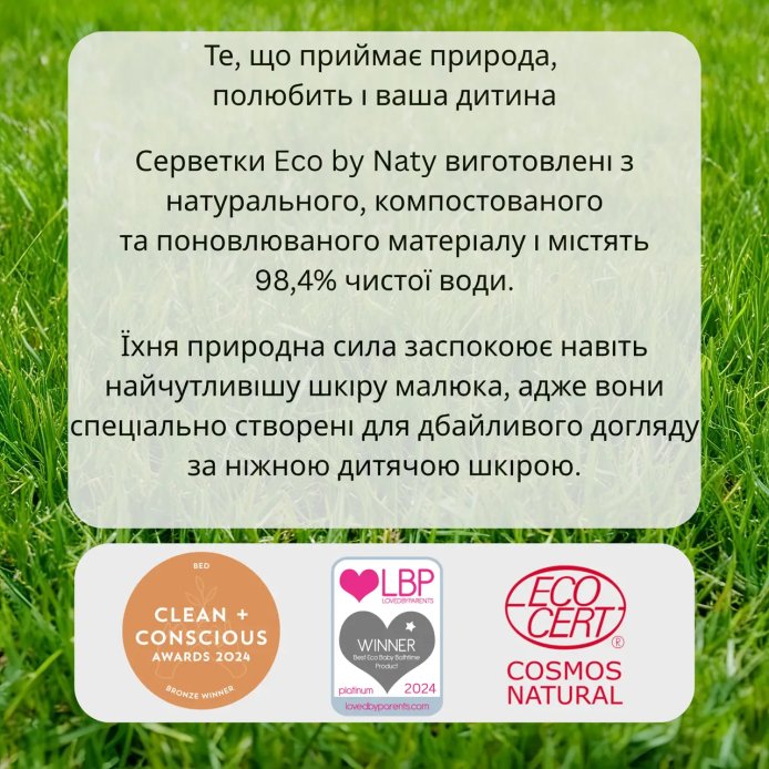 Вони виготовлені з біорозкладної целюлози без ГМО і на 98,5% просочені очищеною водою. Не містять спирту, хлору, парабенів, фталатів, штучних барвників та синтетичних ароматів. Завдяки цьому, вологі серветки Eco by Naty дбайливо очищають і доглядають за шкірою малюка, не викликаючи алергічних реакцій, свербіння і почервоніння.