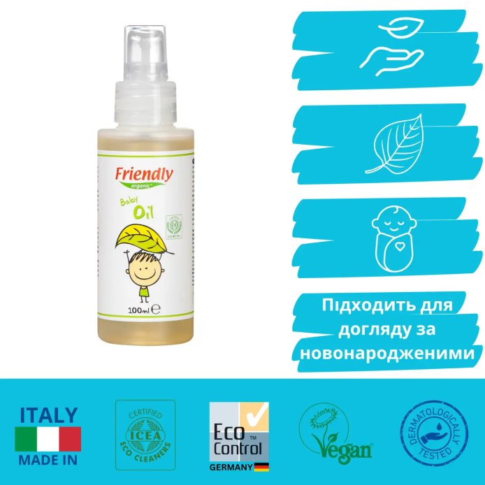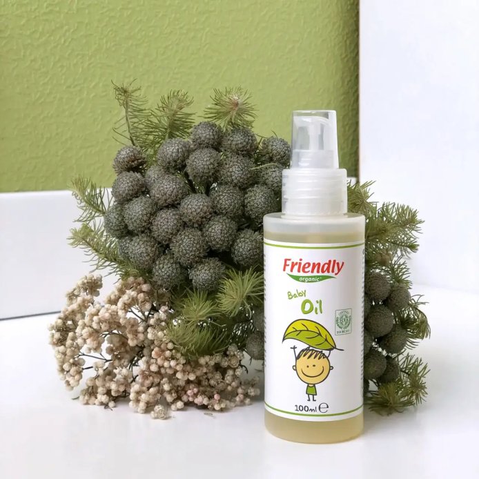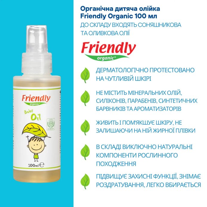 Органічна дитяча олійка Friendly Organic створена для догляду за ніжною і чутливою шкірою малюків.