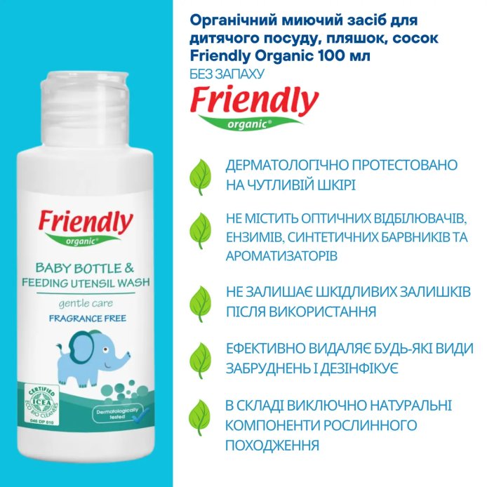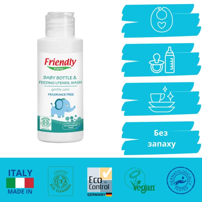 Чистота посуду, яка використовується для годування дитини важлива для кожного з батьків, але не менш важливо, щоб ця чистота була ще й безпечною. Friendly Organic пропонує батькам універсальний органічний засіб, призначений для мийки пляшок для годування та іншого посуду, що знаходиться в побуті маляти.