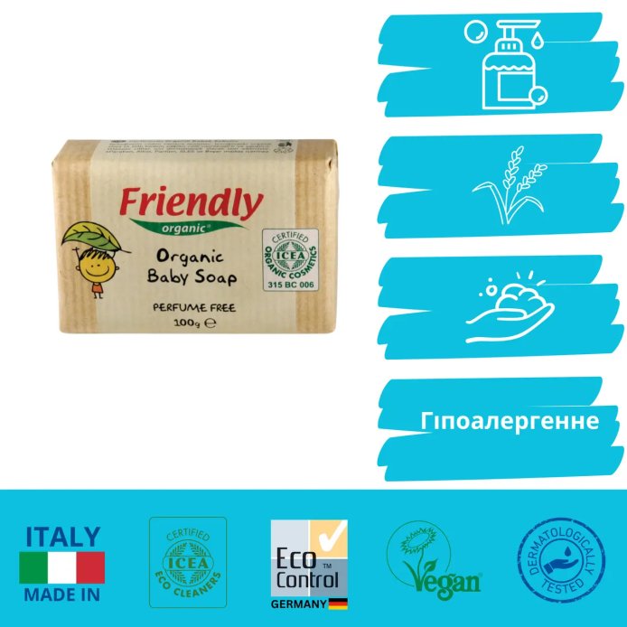 Завдяки бережній формулі, засіб не тільки очищає, але і захищає шкіру від зовнішнього впливу. Після органічного твердого мила від Friendly Organic шкіра рук більше не буде виглядати сухою і роздратованою, не буде лущитися і тріскатися.