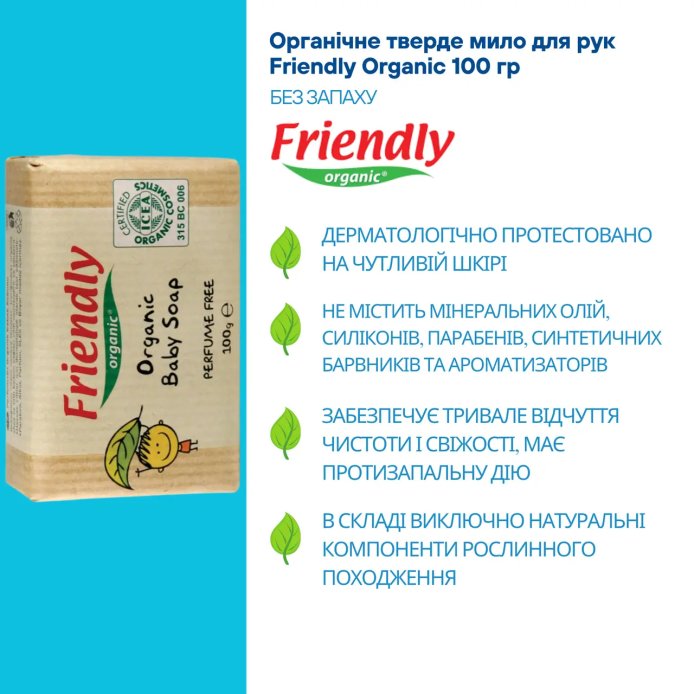 Органічне тверде мило без запаху від Friendly Organic в своєму складі містить тільки натуральні компоненти без агресивних Парів, ароматів, синтетичних барвників, мінеральної олії, силіконів.