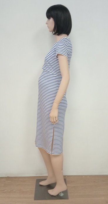 Модель виконана з м’якого еластичного трикотажу з делікатними горизонтальними смужками. Приталений силует гарно підкреслює фігуру та адаптується до змін тіла під час вагітності. Спеціальна верхня частина з потайним горизонтальним доступом дозволяє комфортно годувати малюка будь-де. Короткий рукав і довжина до коліна роблять сукню практичною для повсякденного носіння в теплу пору року. Ідеальний варіант для дому, прогулянок чи поліклініки — стильна мама у кожній миті.