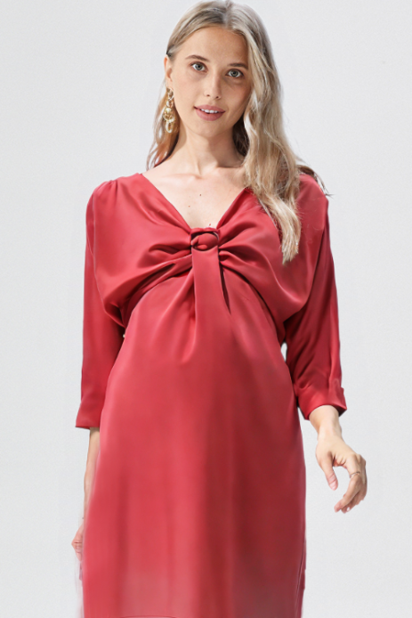Роскошное платье для беременных женщин. Полуприлегающий силуэт. Свободный крой рукавов. Глубокий вырез горловины декорирован драпировкой с кольцами. Мягкие лучи склад от драпировки расходятся в низ, образуя дополнительный объем для животика. Это платье вы с удовольствием продолжите носить и после периода беременности. Разбавьте стильной моделью Ваш образ в магазине Mamacity!