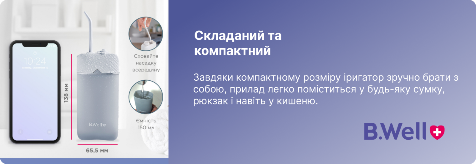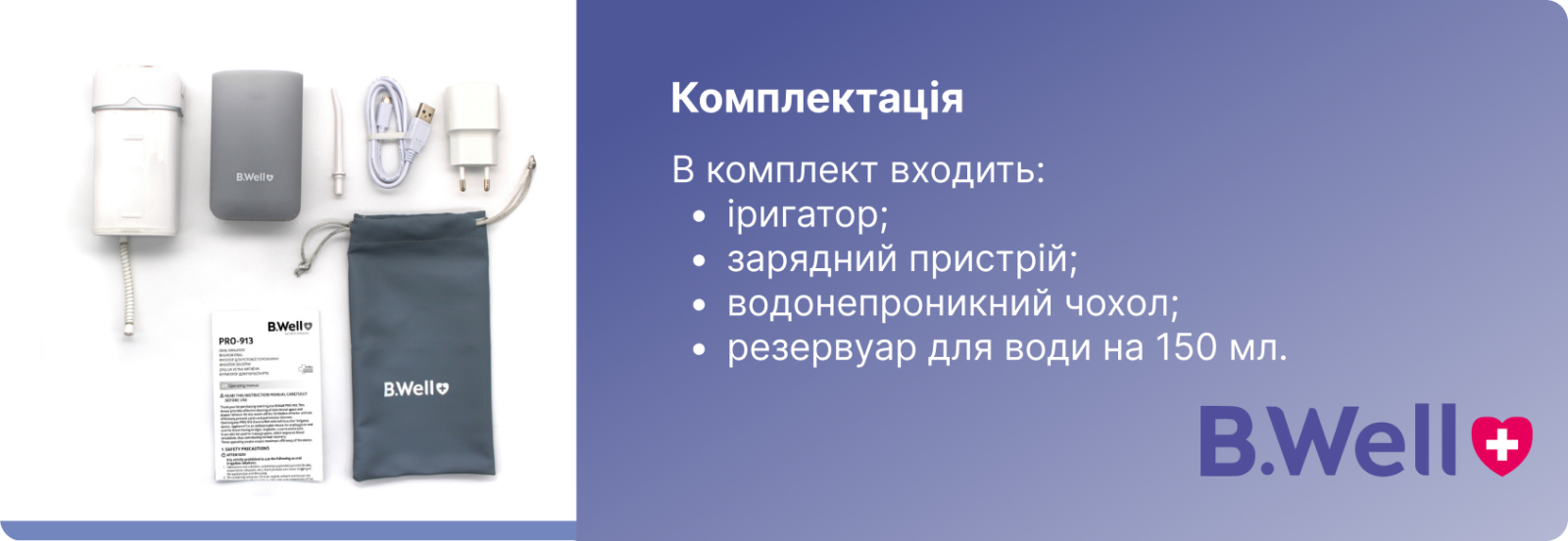 Портативний іригатор B.Well підійде кожному користувачу, завдяки своїй компактності та універсальності. Іригатор B.Well PRO-913 підходить для очищення пломб, мостів, імплантів, коронок і брекетів.