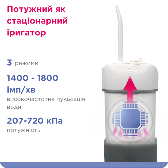 Міні іригатор для ротової порожнини B.Well PRO-913 – професійний прилад, в якому все передбачено для повноцінного догляду за зубами та порожниною рота будинку та в подорожі. ригатор B.Well PRO-913 працює в імпульсному режимі, саме такий принцип роботи іригатора має доведену ефективність. З B.Well PRO-913 легко підібрати комфортний режим. Потужність в залежності від режиму варіюється від 207 до 720 кПа.