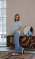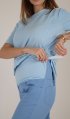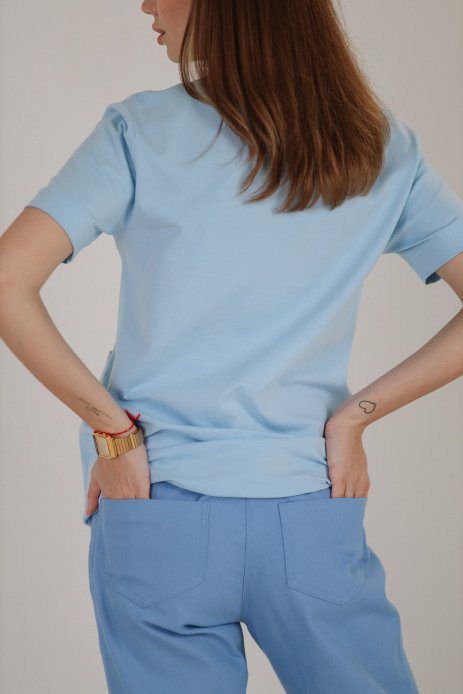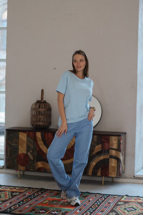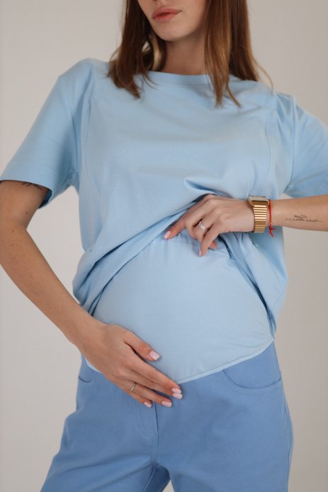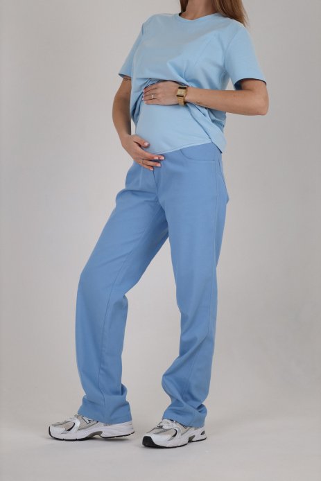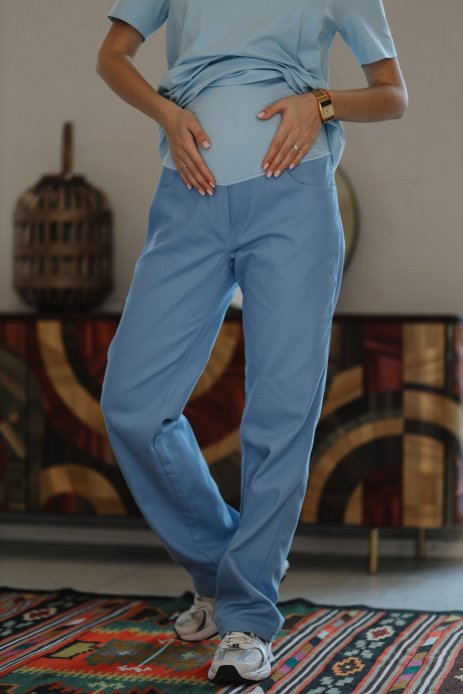 Голубі штани з джинс-котону, для вагітних - це стильний та комфортний одяг, спеціально розроблений для жінок, які очікують дитину. Вони мають високу трикотажну вставку, яка підтримує живіт вагітної, забезпечуючи комфорт та підтримку. Голубий колір штанів додає їм свіжий і яскравий вигляд.