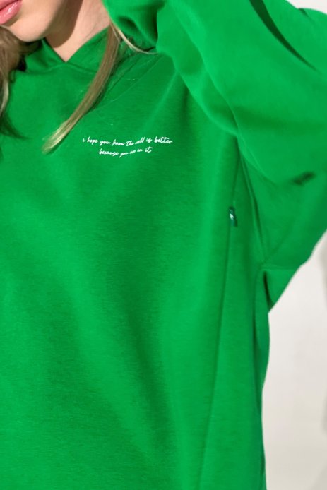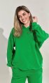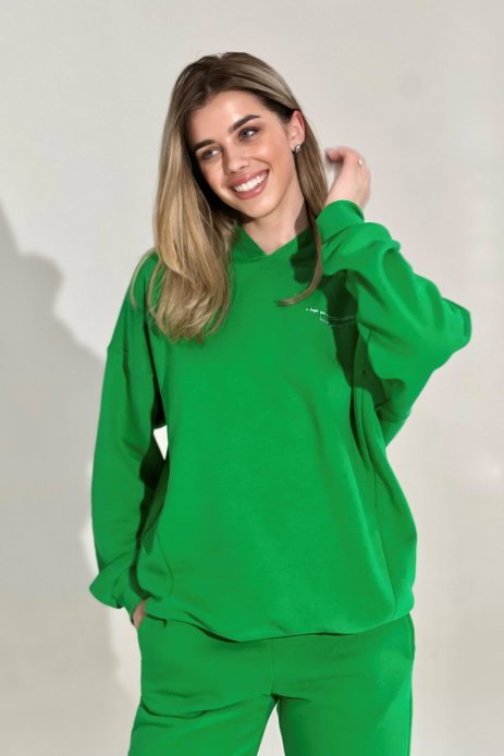 Костюм у трендовому зеленому кольорі, худі надзвичайно тепле, та зручне у використанні. А потаємні блискавки - полегшать годування малюка. На штанах присутня резиночка, для регулювання.
