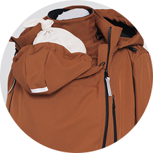 Представляем вам куртку-трансформер! Демисезонная слингокуртка 4 в 1 идет в комплекте с двумя вставками: для беременных и для ношения малыша в переноске спереди и за спиной. Также куртку можно носить и вовсе без вставок: теплая, «дышащая», с отличными ветро- и влагозащитными характеристики, она станет самой функциональной вещью в гардеробе. Чтобы добиться нужных характеристик, мы пошили наши слингокуртки из современного материала Softshell. Ткань состоит сразу из трех слоев: плащевки, мембраны и микрофлиса. Материал эластичный и не сковывает движения, а сама куртка легкая, что немаловажно, учитывая дополнительный вес ребенка.