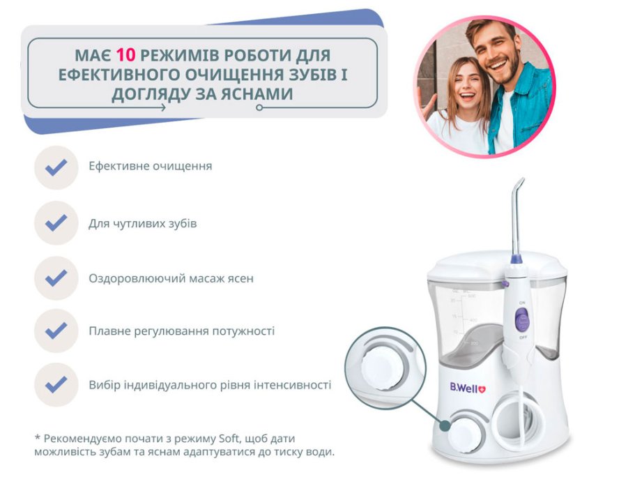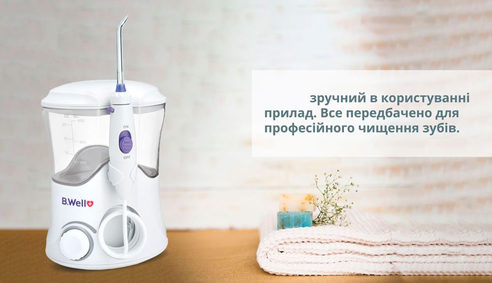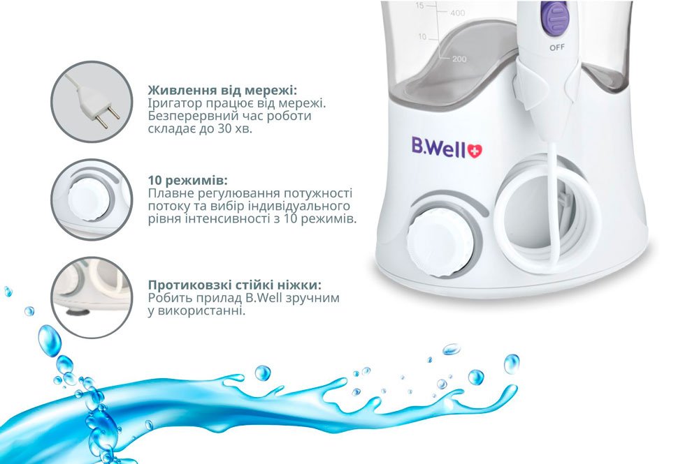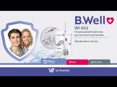 B.Well PRO-922 – модель стаціонарного іригатора, що підходить для всієї родини. Пульсуючий струмінь дбайливо масажує ясна, ефективно очищає міжзубний простір і знімає зубний наліт. Це оптимальний варіант для догляду за ортодонтичними та ортопедичними конструкціями: брекетами, імплантатами, мостами, коронками та ін. Прилад відрізняється високою потужністю та оптимальною кількістю пульсацій струменя, що забезпечує ефективність застосування. Прилад зручно розташовується у ванній та фіксується гумовими присосками на ніжках. Резервуар на 600 мл достатній для здійснення однієї процедури. За рахунок регулювання рівнів тиску кожен може підібрати для себе комфортний режим чищення.