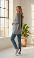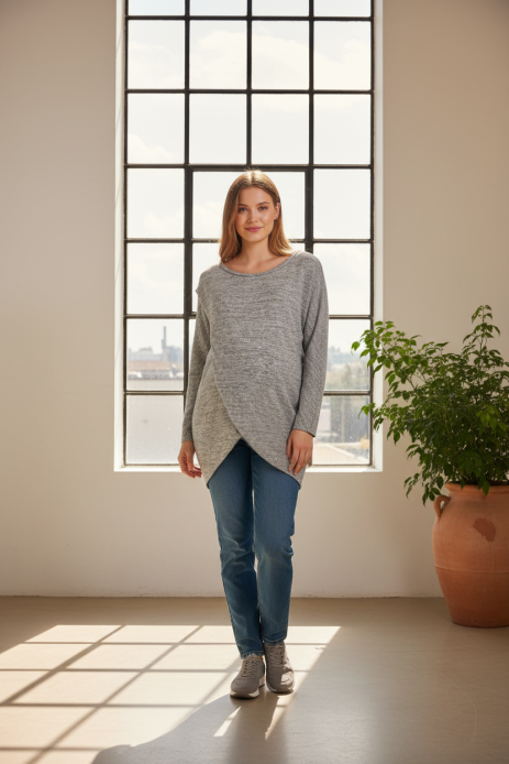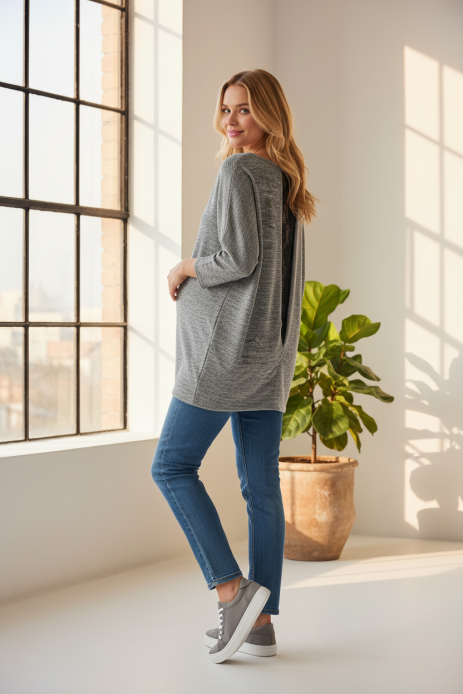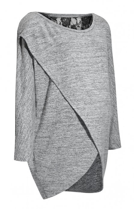 Эффектный свитер-туника свободного силуэта для будущих мам! Модель непременно понравится ценителям оригинальных дизайнерских идей. Выполнена из плотного вискозного трикотажа серых оттенков. Оригинальный крой с запахом спереди и изящное рельефное черное кружево по спине великолепно подчеркивают изысканный вкус обладательницы этой модели как во время беременности, так и после ее окончания. Такой свитер прекрасно комбинируется различными вариантами верхней и нижней одежды, а также украсит вечерний выход. Разбавьте яркой моделью Ваш обычный образ в магазине Mamacity!