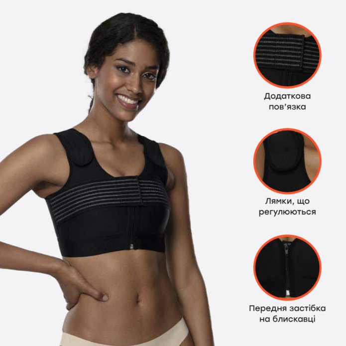 Бюстгальтер з додатковою пов'язкою 7 см, який використовується при операціях по збільшенню і зменшенню грудей після всіх операцій на грудях, виготовлений з двошарового м'якого гнучкого матеріалу, з передньою блискавкою, що зменшує набряк і прискорює процес загоєння.