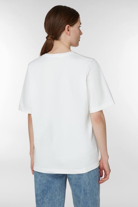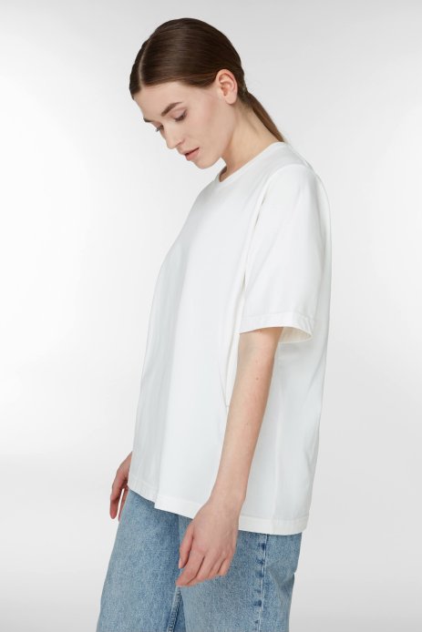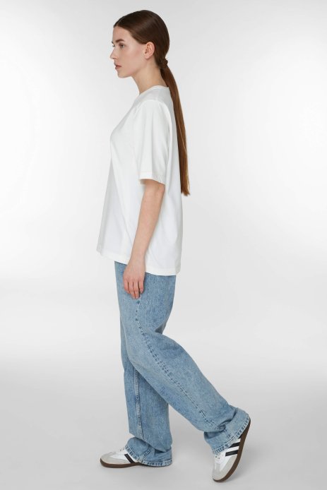 Футболка прямого крою з акуратним круглим вирізом і рукавами без одворотів.
