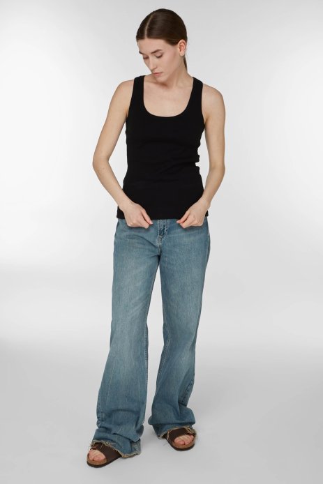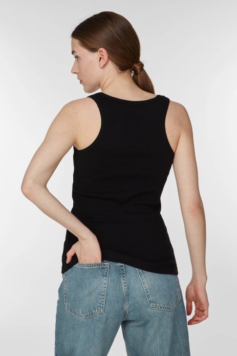 Майка з рельєфного трикотажу в рубчик з глибоким вирізом і широкими бретелями стане основою вашого casual образу. Майка відмінно поєднується з джинсами, брюками, спідницями, шортами.