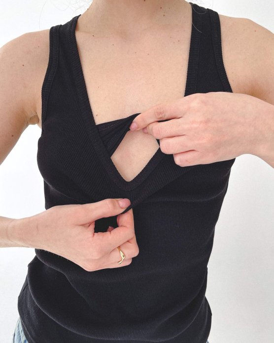 Секрет для годування - подвійна майка - тонкий м'який трикотаж, вшитий на грудях під основною майкою дозволить вам зручно і непомітно погодувати малюка. Для того, щоб скористатися секретом, потягніть верхню частину майки вниз, а підкладковий трикотаж наверх, створюючи ефект закритого декольте.