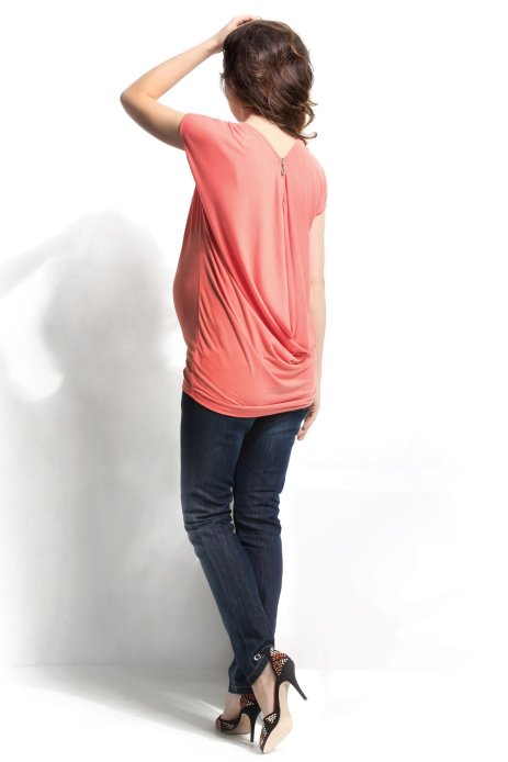 Стильна блуза - туніка для вагітних. Вільний звужений до низу силует. Цільнокроєна рукав. Округла форма виріз горловини, з невеликою збіркою, по переду і V - образна по спинці. Ефектно оформлена спинка блузи: золотиста застібка блискавка, від якої водоспадом розходиться драпірування. Фігурна лінія низу. Цю блузу ви із задоволенням продовжите носити і після вагітності. Розбавте яскравою моделлю Ваш звичайний спосіб в магазині Mamacity! Колір: абрикосовий. Склад: 94% віскоза, 6% еластан.