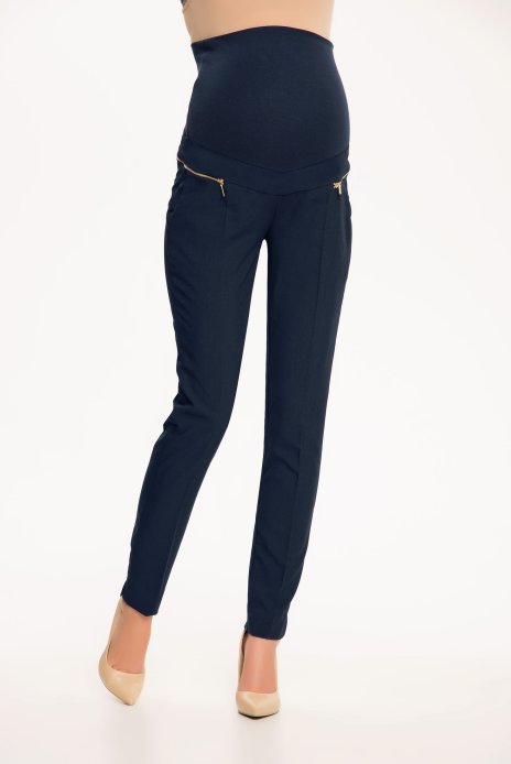 Чудова класична модель - штани для вагітних! Виконано з костюмної тканини. Фасон прямий, по фігурі, трохи звужений до низу. Оригінальною прикрасою цієї моделі є контрастна блискавка, розташована паралельно кишенях. Задні кишені представлені у вигляді імітації. Нижня частина штанин з маленькими розрізами. Для максимальної зручності та підтримки ця модель забезпечена трикотажним поясом на животик. Модель підходить для роботи в офісі і для щоденного носіння.