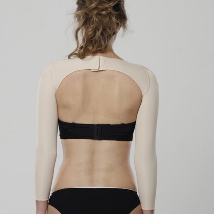 Рукава Aurafix LC-1910 утримують руки в правильному положенні за допомогою прозорої силіконової стрічки спереду і застібок на гачках з боку спини. Компресія усуває набряклість, покращує кровотік і стимулює лімфодренажні діяльність.