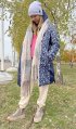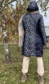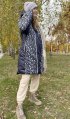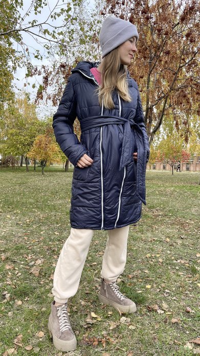 Таку модель, за задумом дизайнера і під власний настрій, можна носити на дві сторони, які виконані дзеркально, але обіграні різними кольорами, при цьому обидві вони доповнені цікавим рішенням - на однотонної стороні кишені накладні , а на прінтована - кишені на блискавках. Обидва варіанти досить зручні, виглядають стильно і красиво. Після закінчення вагітності таке пальто можна носити як звичайне виріб, підв'язуючи пояс, який додається в комплекті.
