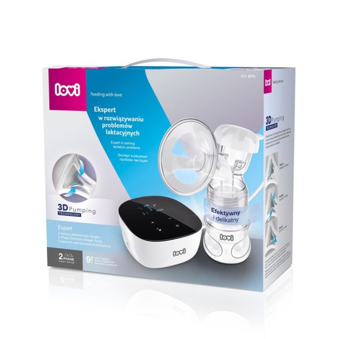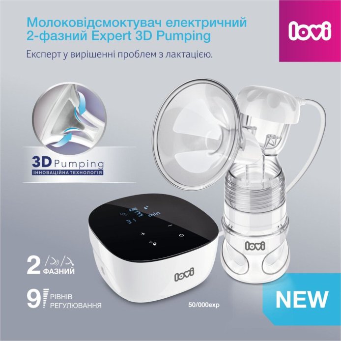Двофазний Електричний Молоковідсмоктувач LOVI Expert - експерт у вирішенні проблем з лактацією (наповнені груди, застій молока, стимуляція лактації, зберігання молока, повернення до роботи). Він ніжно та якісно зціджує молоко, за допомогою інноваційної технології 3D Pumping.