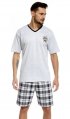 Пижама выполнена из высококачественного натурального хлопка, серого цвета состоит из однотонной футболки с коротким рукавом и шорт в клетку. V-образный вырез горловины обработан кантом черного цвета, слева нагруди принт. Благодаря натуральным свойствам ткани такой домашний комплект отлично впитывает влагу, позволяет телу "дышать". Носить можно не только как одежду для сна, а и как одежду для дома.