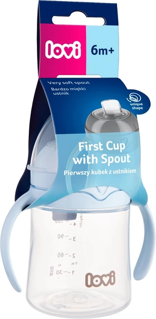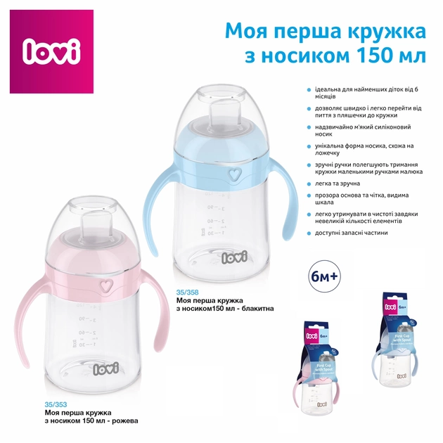 Моя перша кружка Lovi з носиком 150 мл - ідеальна, щоб навчитись самостійно пити для малюків від 6 місяців. Дозволяє швидко і легко перейти від пиття з пляшечки до кружки. Надзвичайно м'який силіконовий носик - тонкий силікон полегшує дитині натискання, завдяки чому вода швидше витікає. Водичка з кружки капає вільно, щоб малюку не довелось докладати багато зусиль для освоєння нових навичок. Унікальна форма носика, схожа на ложечку. Зручні ручки полегшують тримання кружки маленькими ручками малюка. Легка та зручна - кружка розрахована на невелику силу та спрагу малюка на початку навчання питтю. Завдяки невеликій кількості елементів, кружку легко мити. Можна мити в посудомийній машині та підігрівати в мікрохвильовій печі.