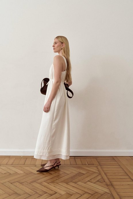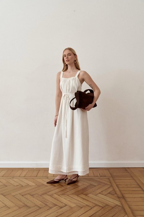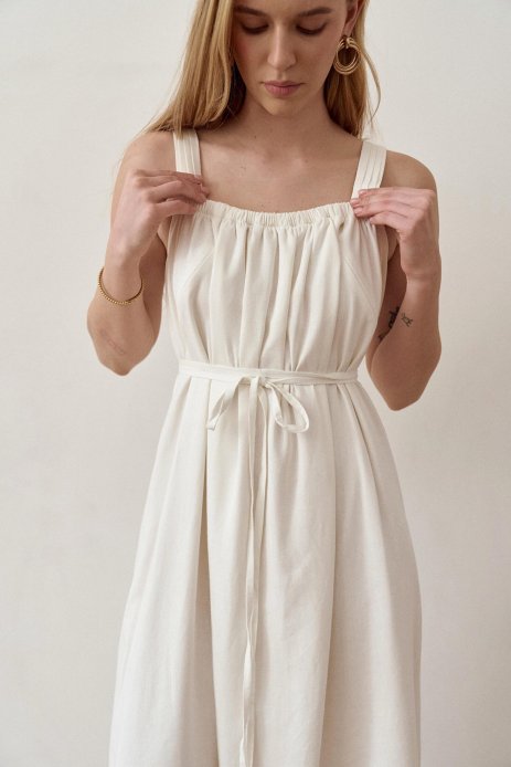 Бретелі оформлені декоративними складками. А пояс, що йде в комплекті, дозволяє красиво підкреслити талію або носити сарафан вільно — залежно від стилю та настрою. Він додає образу жіночності та легкого акценту, роблячи модель ще більш універсальною. Нижня частина моделі оформлена витонченими складками, що створюють м’який силует і надають сарафану особливого шарму та легкості.