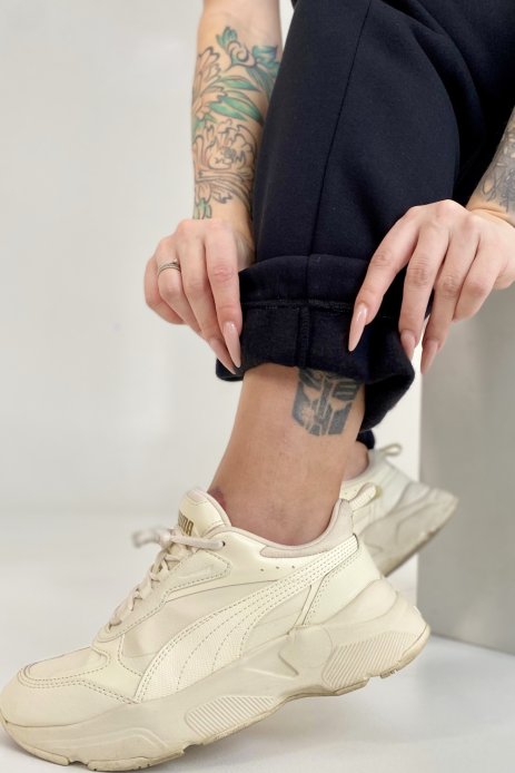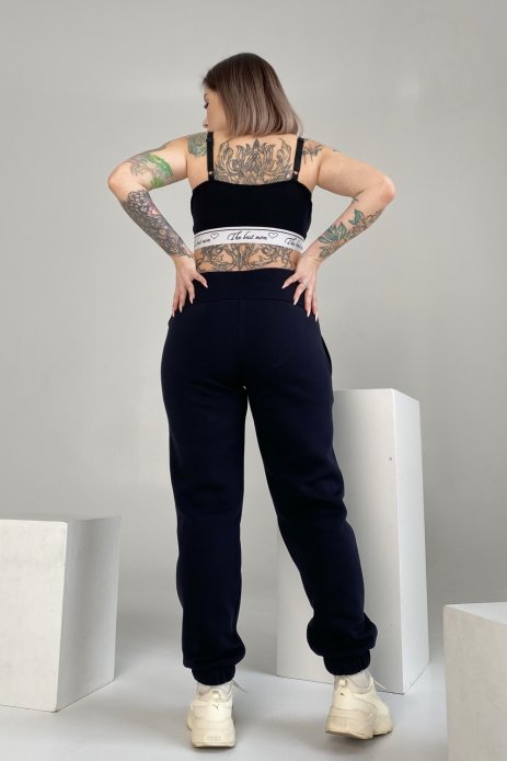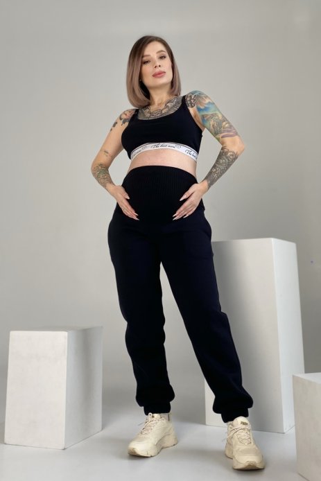 Чорні штани на флісі з регулюючою трикотажною в рубчик вставкою, яка надає додаткову підтримку животику під час зростання.
