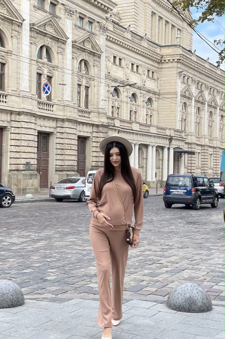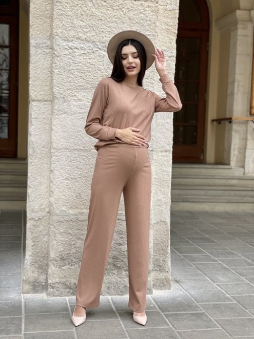 Штани для вагітних. Мають вільний крій вгорі, конструкція поясу виконана дуже зручно, вона еластична під животиком, що забезпечує стабільну посадку і дозволяє носити виріб і після вагітності. Штани гармонійно поєднуються з різноманітним верхом. Ця стильна модель буде дуже важливою складовою Вашого річного модного образу. Додайте нову модель до свого гардеробу з магазину Mamacity!