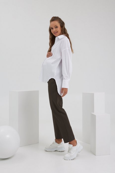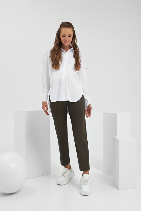 Стильна сорочка виконана з високоякісного стрейчевого бавовни. Горловина оформлена відкладним коміром на стійці. Виріб має планку з гудзиками, по боки розрізи. Довгий втачной рукав з манжетом, низ асиметричний. Дана модель неймовірно зручна, завдяки складочкам під грудьми створюється простір для зростаючого животика. Цю модель Ви будете із задоволенням носити і після закінчення періоду вагітності, і за рахунок вільного фасону відмінно виглядати на фігурі. Вдало поєднується з будь-яким низом і може доповнити як діловий, так і повсякденний стиль. Ми впевнені, що ця модель, завдяки своїй універсальності, стане вдалим доповненням в будь-якому гардеробі.