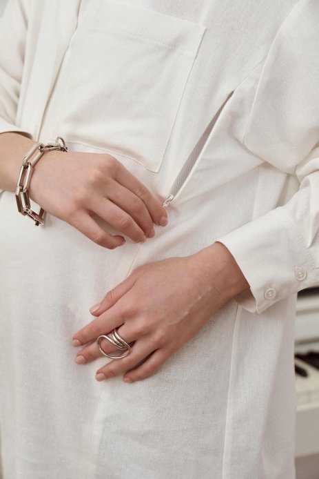 Секрети для годування – дві потаємні блискавки, які відкриваються зверху вниз. Вони акуратно вшиті в конструктивні лінії та залишаються абсолютно непомітними, тому сорочка виглядає як звичайний стильний одяг, але з додатковим комфортом для годування грудьми в будь-який момент.