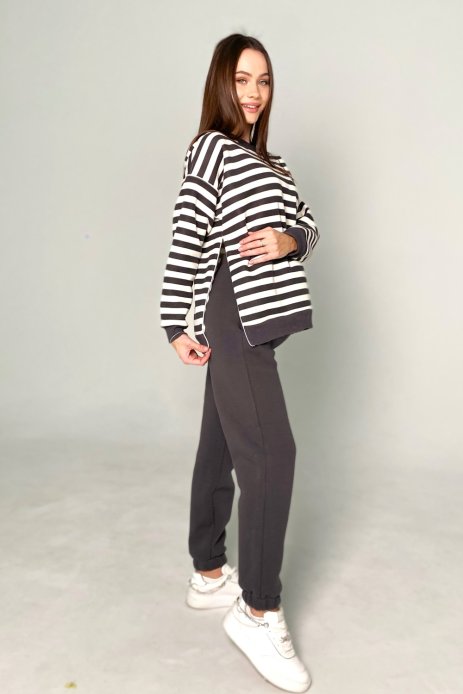 Теплий світшот 2357 1142 у білу смужку та однотонні теплі штани 2315 1147 для вагітних та годуючих матусь, утворюють надзвичайно стильний і мега комфортний костюм, який дозволить відчувати себе тепло і затишно. Простий класичний фасон ідеально підійде для повсякденного носіння.