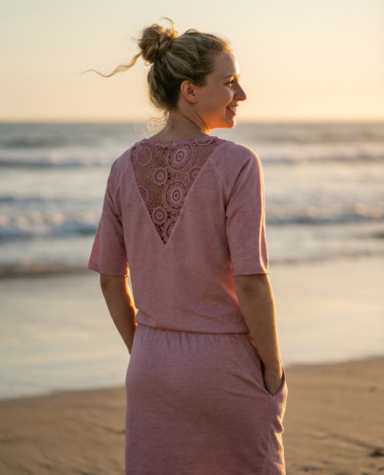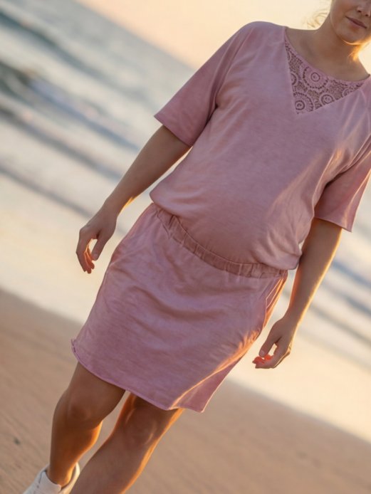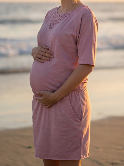 Особливий шик - сукня з напуском! Виконано з натурального 100% бавовни. Тканина має приємну дихаючу і не жарку текстуру. Фасон моделі виконаний в ніжно-рожевому кольорі, довжина до колін, рукавчик - реглан. Об'ємний верх сукні декорований витонченим мереживом, яке красиво відкриває область грудей і спини, а так само підкреслять манжет на стегні поясом-гумкою, завдяки якому можна регулювати довжину сукні і зручно розташовувати зростаючий животик під час вагітності. Ще однією помітною деталлю цієї моделі є зручні накладні кишені. Таке плаття вигідно підкреслює стегна і робить акцент на ніжках, носиться під час вагітності і після. Додайте яскраву модель до свого гардеробу з магазину Mamacity!
