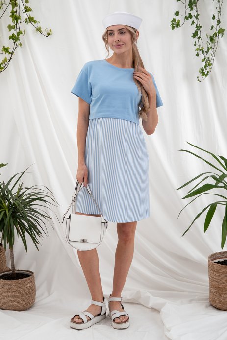 Сукня для вагітних та годуючих, що складається з трикотажнго топу поверх сарафана з легкою спідницею.